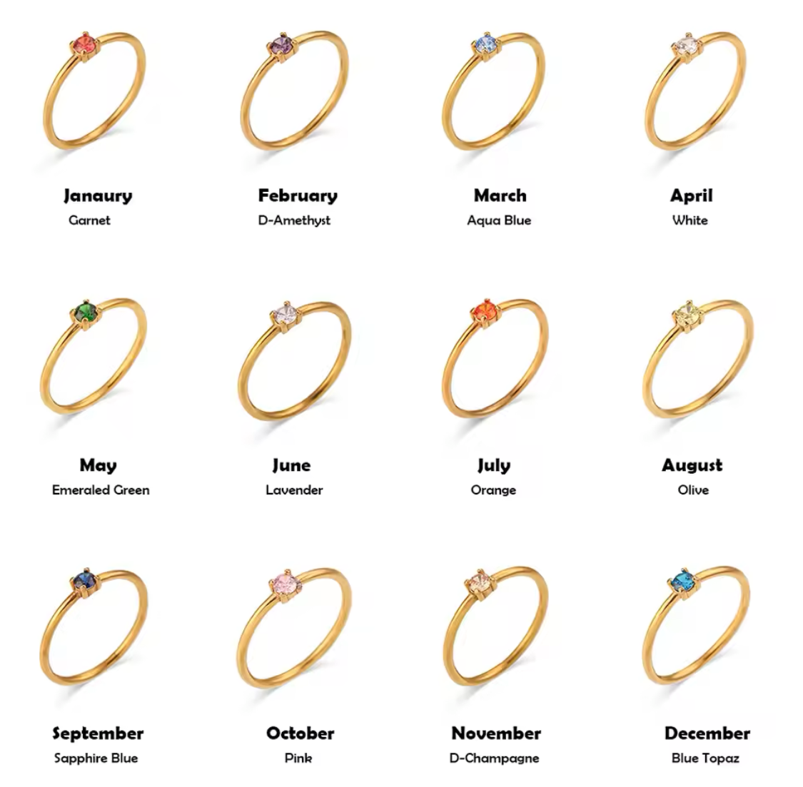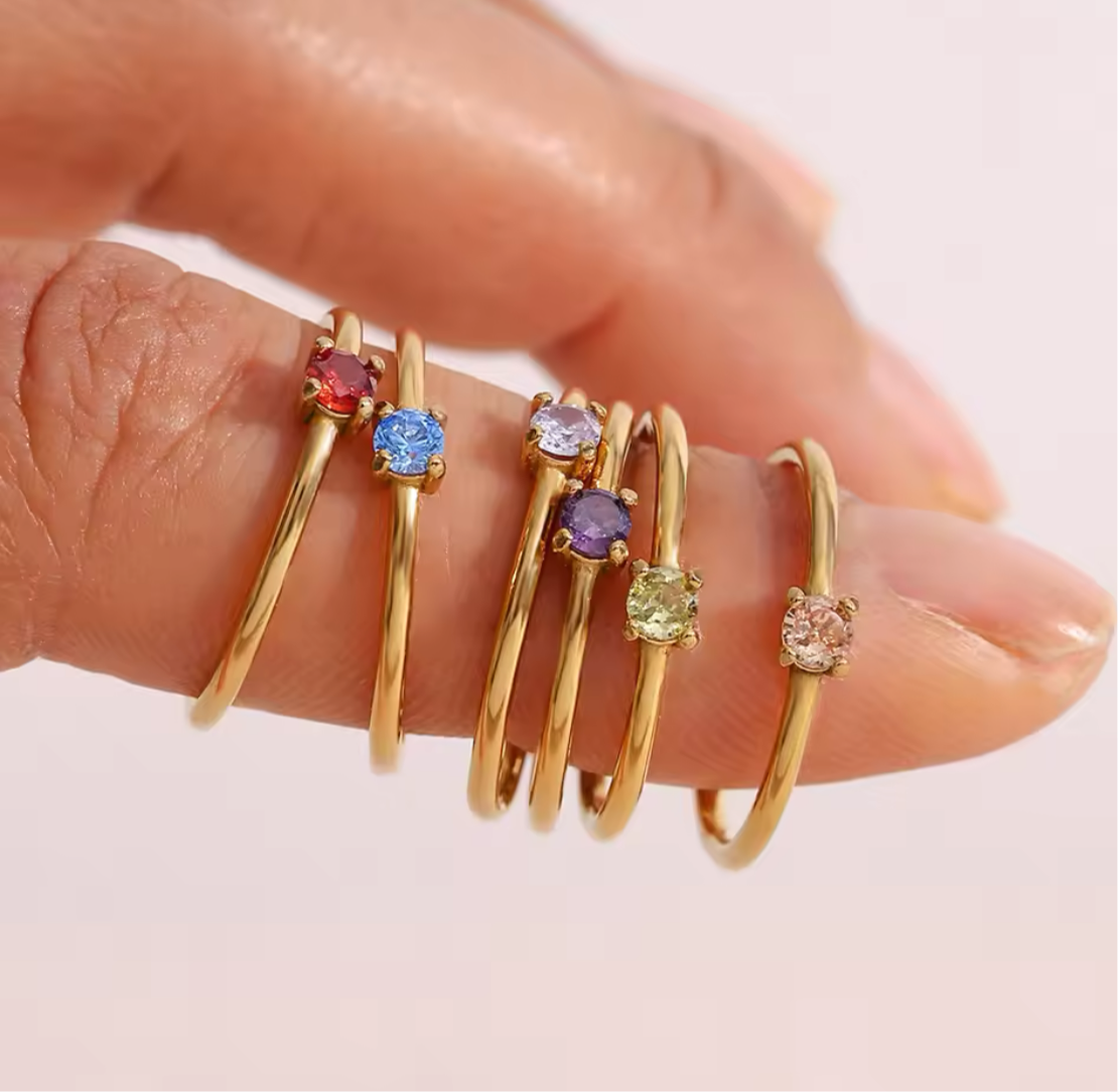 Chique en stijlvolle geboortesteen maand ringen van stainless steel met een laagje 18 karaat goud. De 3 mm zirkonia steentjes zijn er in 12 kleuren passend bij iedere maand en worden stevig vast gezet in de ring zetting.